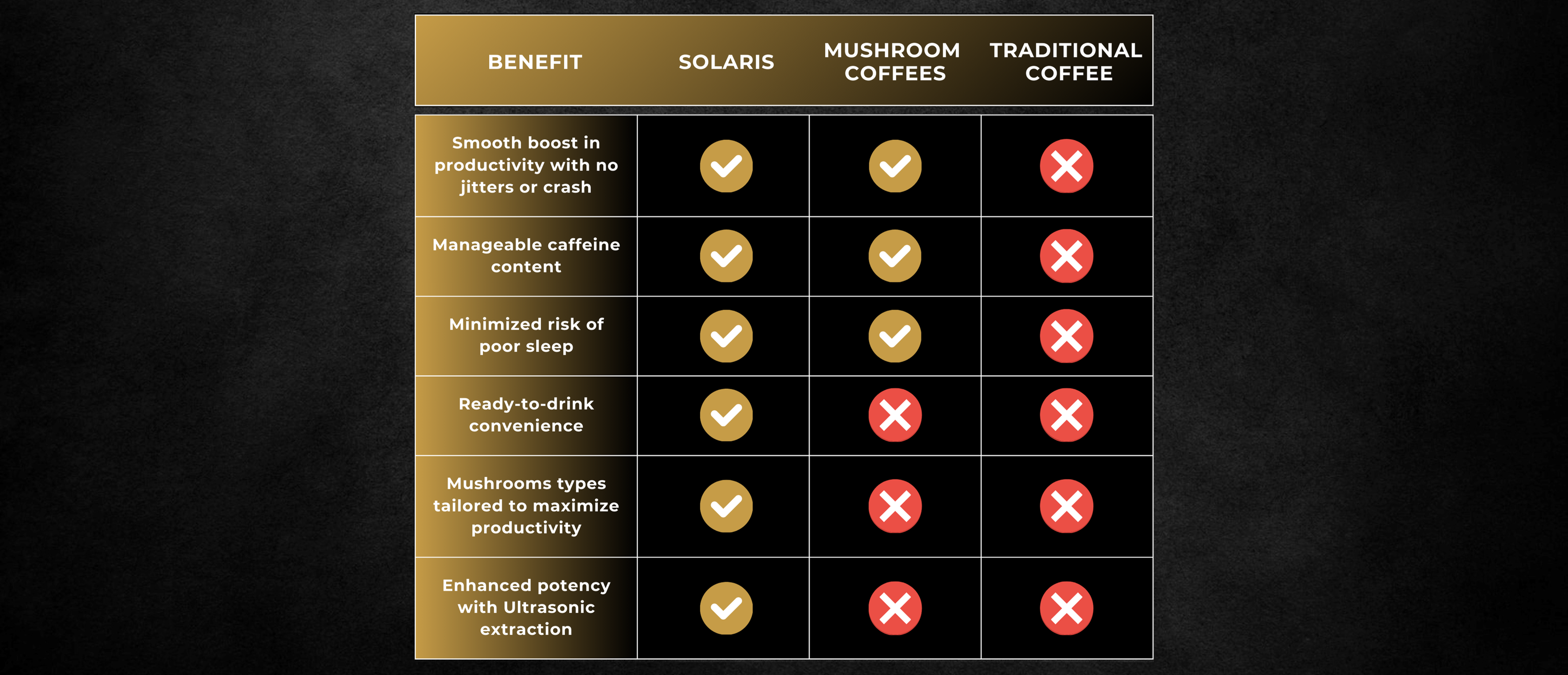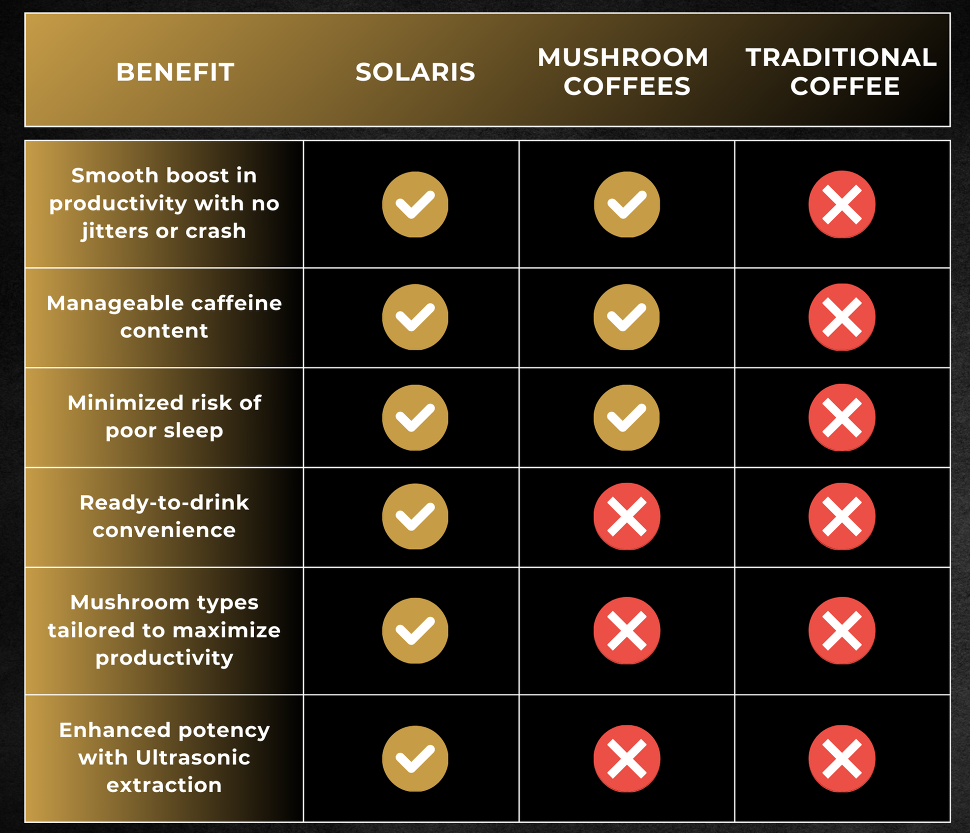 Solaris Wellness provides a more balanced uplift in productivity and motivation compared to traditional coffee and energy drinks.