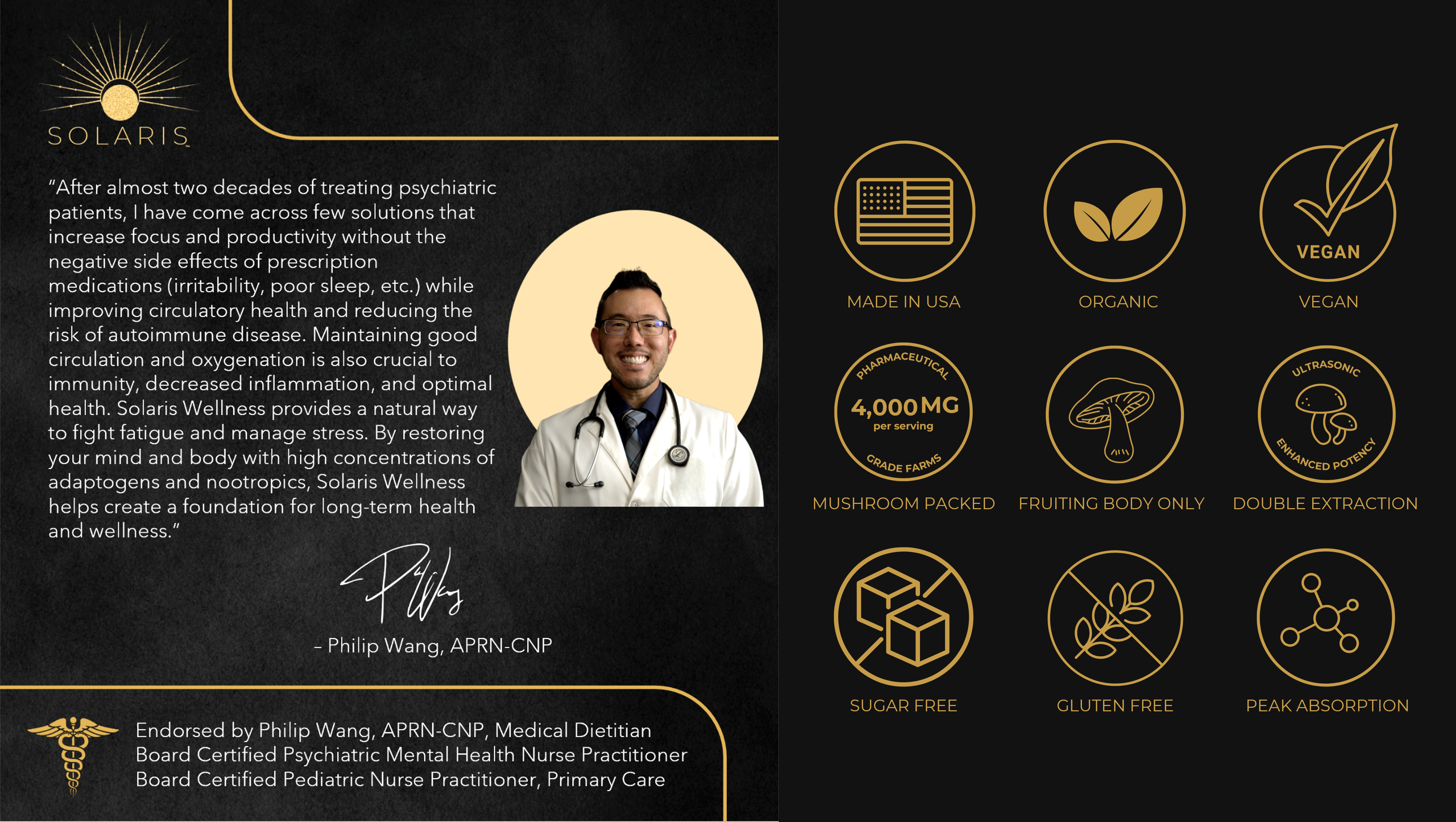 Solaris Wellness is 100% vegan, sugar free, gluten free, and soy free. The functional mushrooms are organically grown.