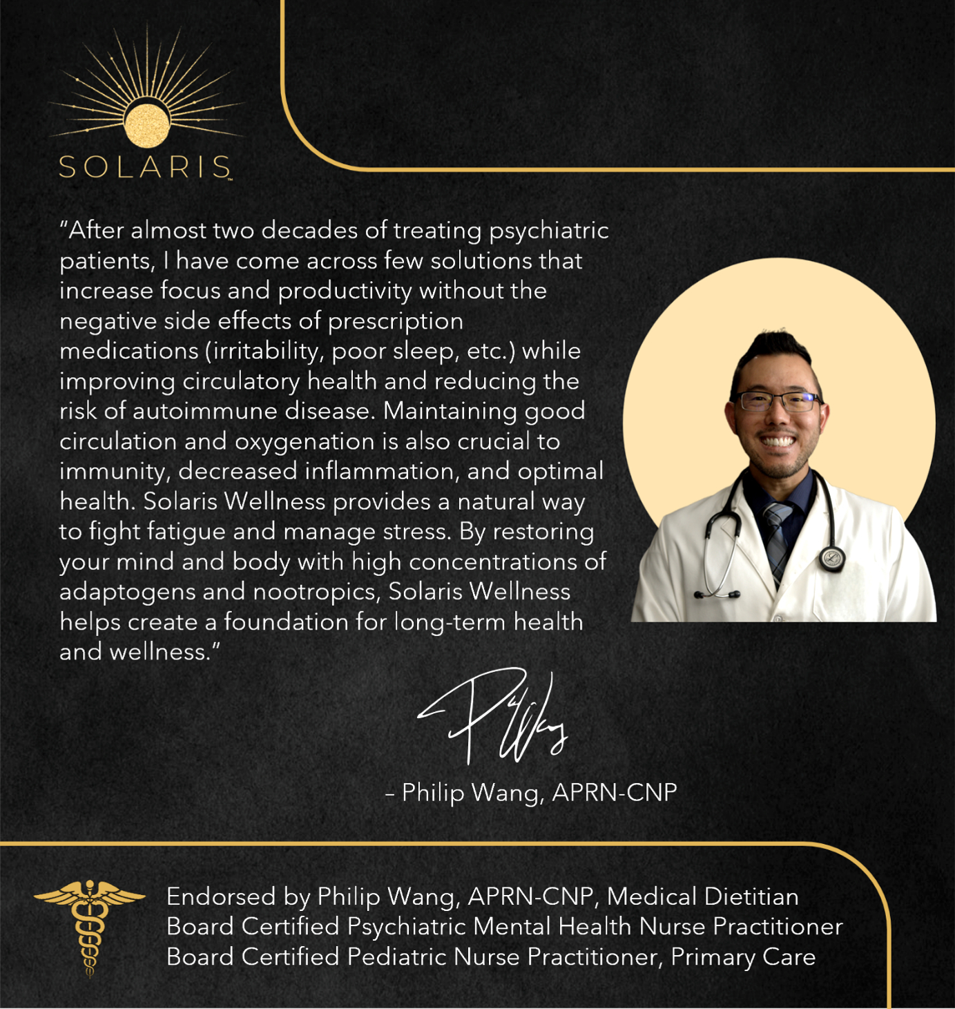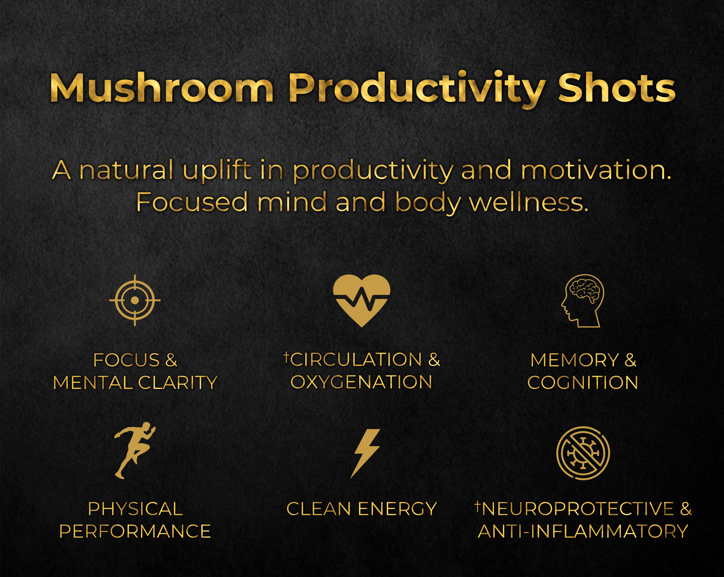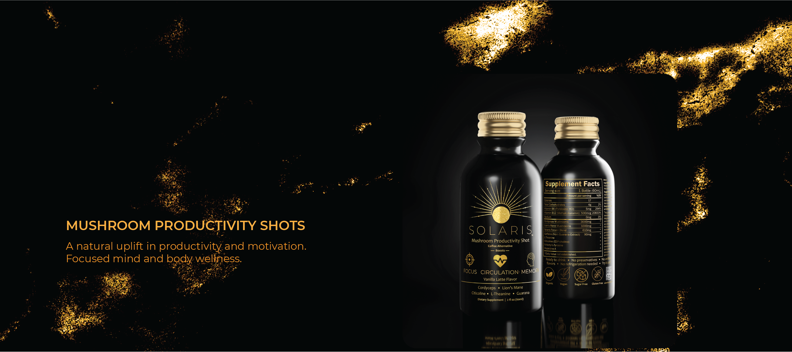 Each bottle of Solaris Wellness is packed with unprecedented potencies of concentrated mushroom extracts (4000mg) and other adaptogens / nootropics that provide a wealth of health benefits. These productivity shots are more fully absorbed than gummies / capsules and are a great energizing alternative to coffee and energy drinks without the jitters, crash or poor sleep!