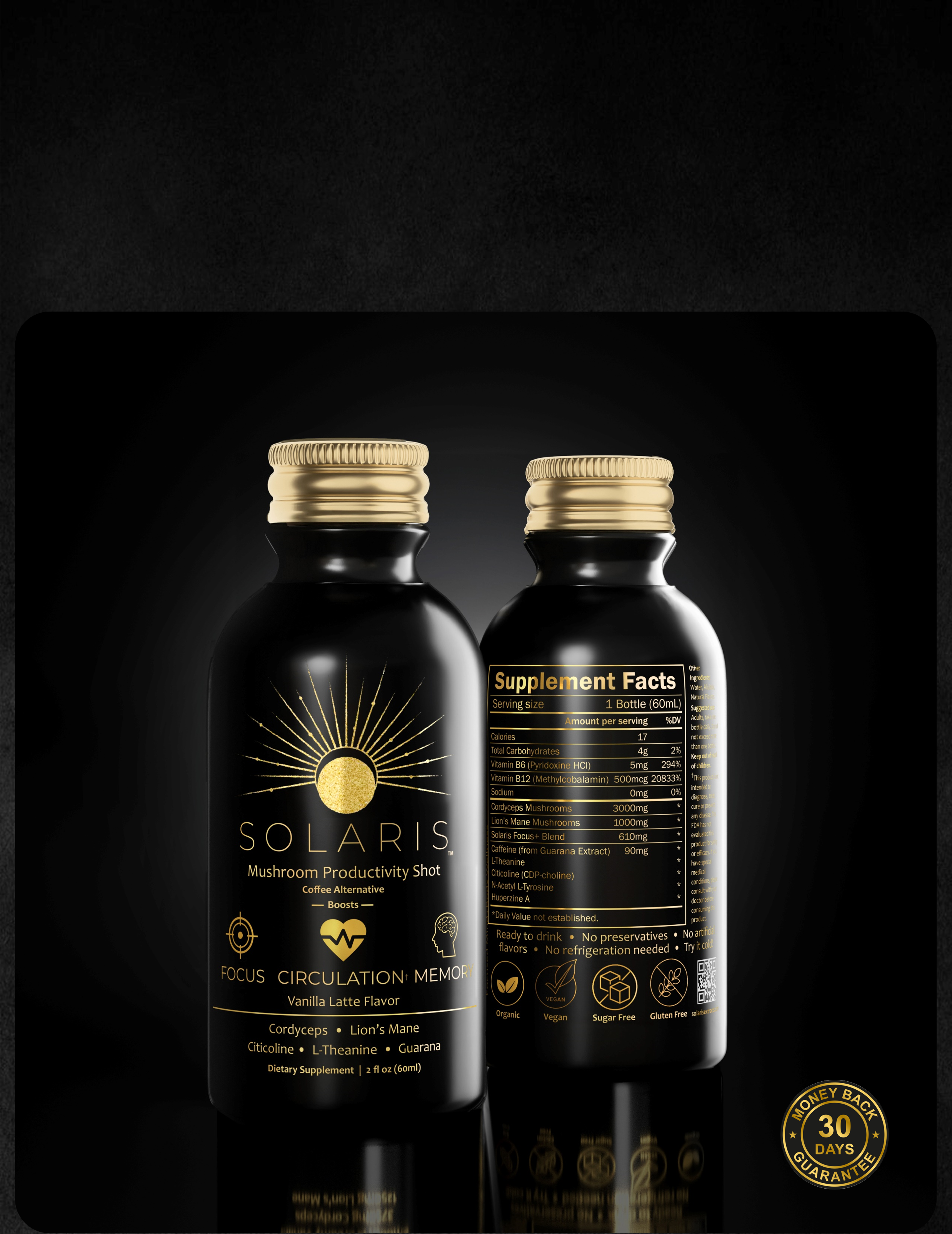 Solaris Wellness leverages the powerful properties of Cordyceps and Lion’s Mane mushrooms. These functional mushrooms are known for their ability to enhance productivity, improve mental clarity, and increase focus, and in combination with the powerful Solaris Focus+ nootropics stack and guarana extract caffeine, provides a natural and effective alternative to traditional coffee and energy drinks.